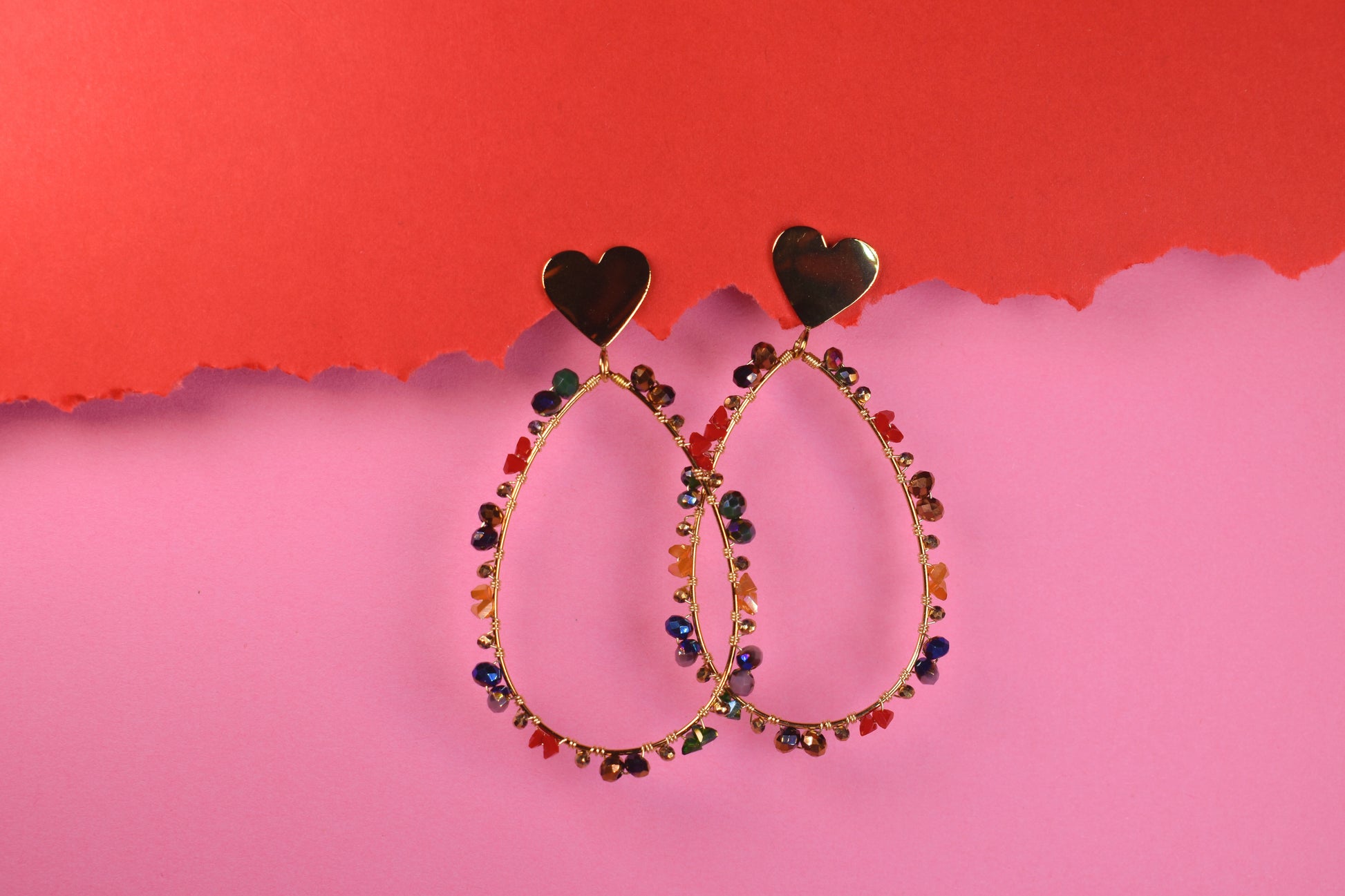Los pendientes Reyes son una verdadera joya de diseño. Su forma ovalada, bordeada por delicadas cuentas en tonos púrpuras y dorados, enmarca un corazón central lleno de simbolismo. El contraste del dorado con el color vibrante de las cuentas crea una pieza que se siente lujosa y artesanal al mismo tiempo. Son perfectos para quienes buscan un accesorio con significado, carácter y mucha luz.